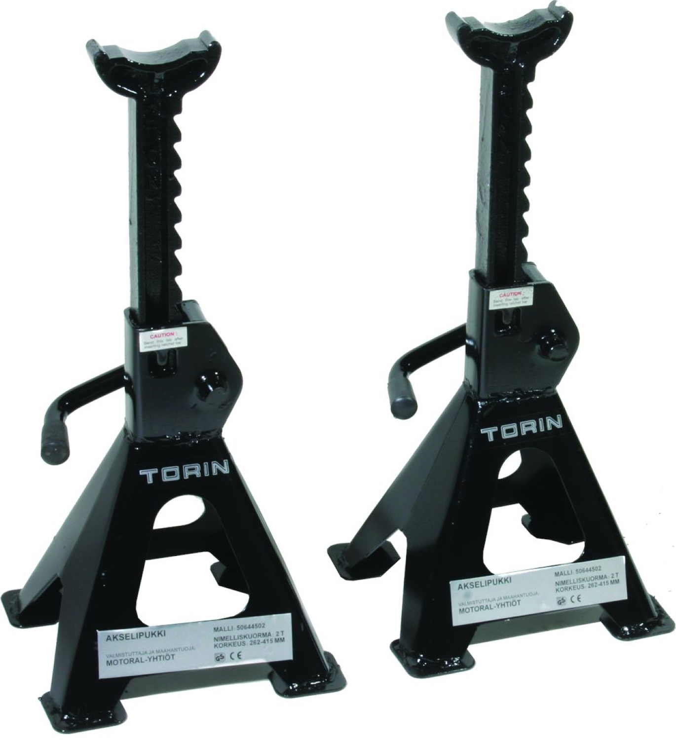 Tukeva akselipukki esim. auton ylhäällä pitämiseksi huoltotöiden aikana. Jalkojen alla leveät seisontaa tukevoittavat "tassut". Pakkauksessa 1 pari.