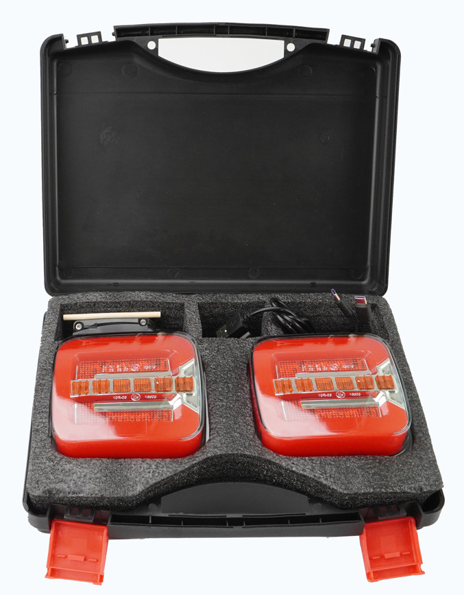 Langattomaan valosarjaan kuuluu kaksi LED-takavaloa, 7-napainen valopistoke, USB-latausjohto sekä lataussovittimet verkkovirtaan ja tupakansytytinpistokkeeseen. Tuotteet on pakattu muoviseen säilytyslaatikkoon.