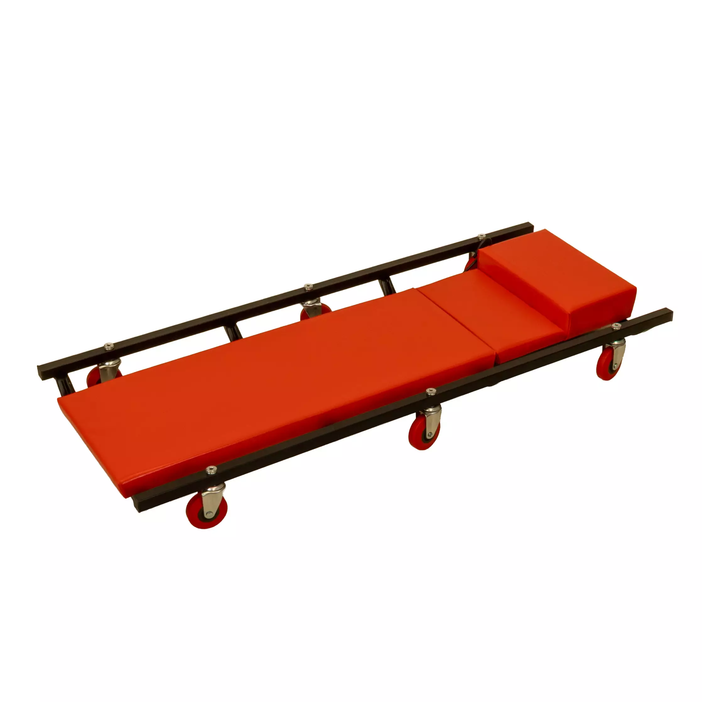 Tukeva ja ergonominen asentajan alusta kuudella pyörällä. 35 astetta säädettävä niskatuki parantaa työskentelymukavuutta. Kestävä pulverimaalattu teräsrunko.