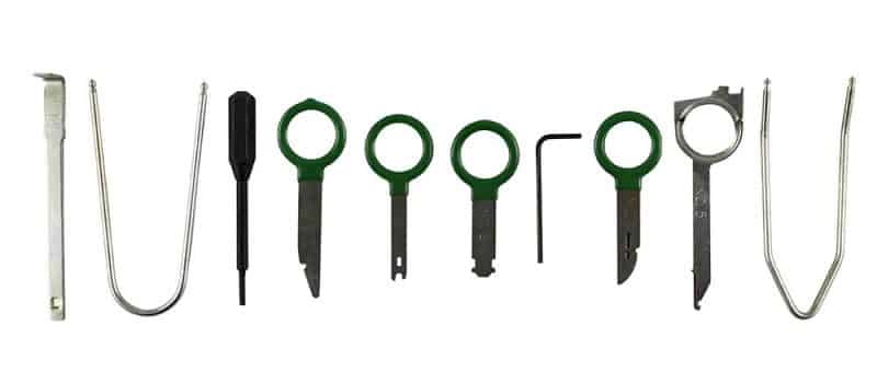 Kattava ja runsas työkalu- ja välinepaketti, jonka avulla irrottaa autoradion helposti, varmasti ja turvallisesti.