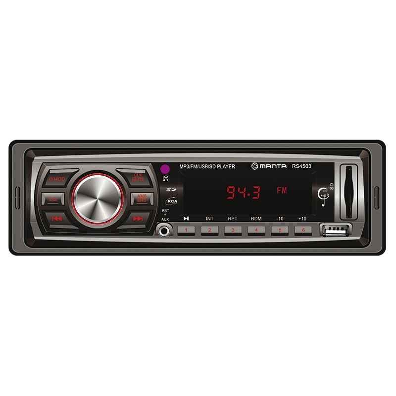 Autoradio MP3 Manta on kiinteällä etupaneelilla varustettu stereo-autoradio 18 tallennuspaikalla ja MP3 soittimella. SD korttipaikka ja USB liitin.