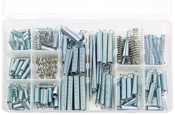 Sisältää 20 erivahvuista ja pituista jousta, yhteensä 200 kpl suljettavassa muovi rasiassa.