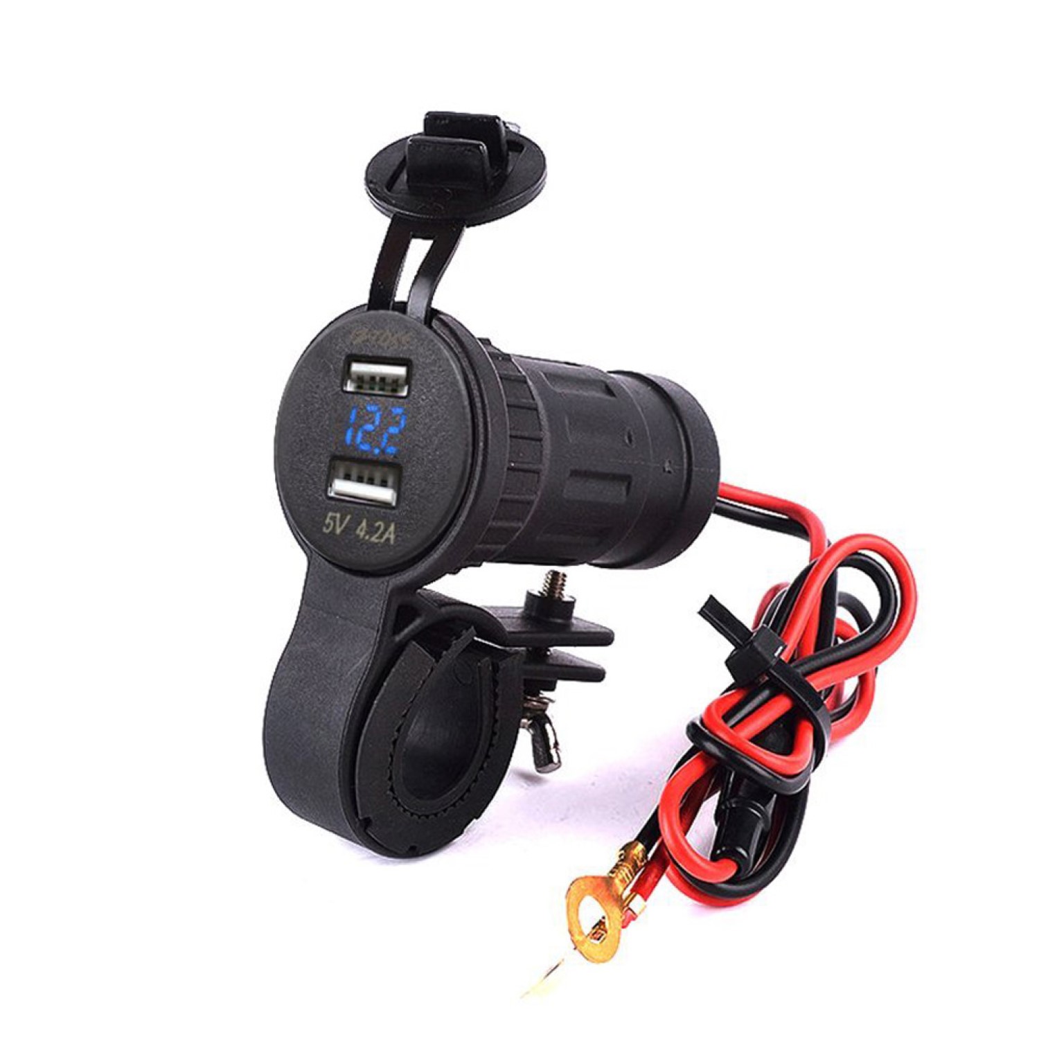 Ohjaustankoon kiinnitettävä USB-latausportti 60 cm virtajohdolla. Voi ladata kahta laitetta samanaikaisesti. Soveltuu käytettäväksi monenlaisissa ajoneuvoissa kuten moottoripyörät, mönkijät, mopot, veneet. Soveltuu yleisimpien laitteiden lataamiseen, kuten puhelimet, tabletit, navigointilaitteet ja GPS:t.