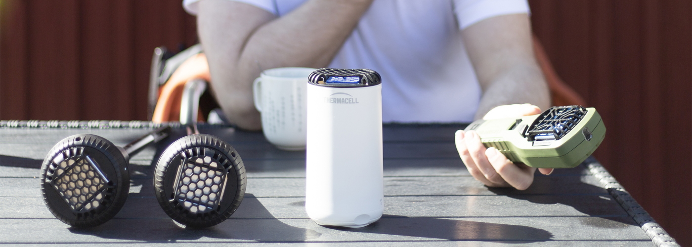 Thermacell Perimeter -hyttystorjuntalaitteet. Kahdella hyttystorjuntalaitteella saa aikaan n. 40 m² hyttysvapaan alueen 10–15 minuutissa.