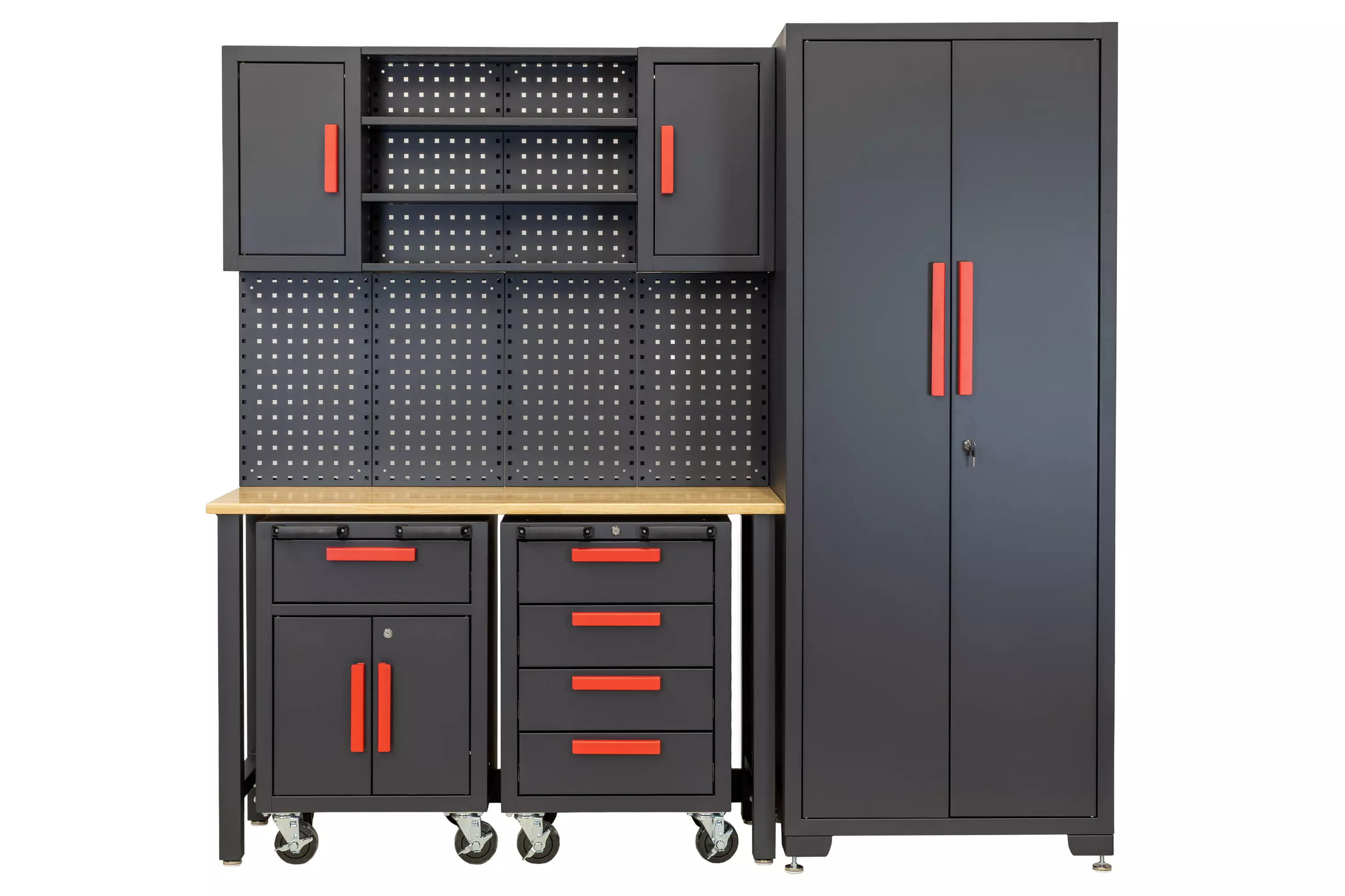 Täydellinen säilytysratkaisu autotalliin tai varastoon. Tyylikäs musta teräskalusto punaisilla kahvoilla. Sisältää korkean kaapin, työkaluvaunun ja laatikoston, työpöydän massiivipuutasolla ja seinäkaapit.