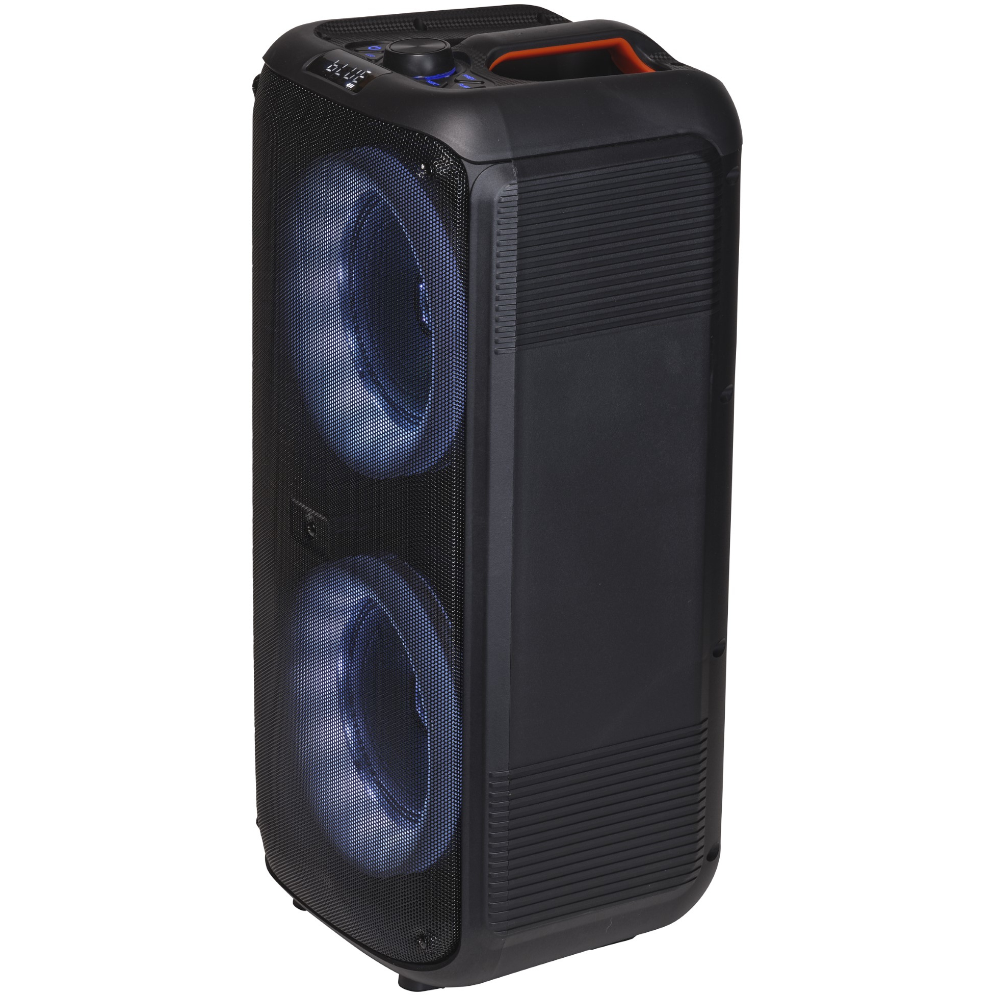 Bluetooth-party-kaiutin LED-valoilla, USB- ja MicroSD-korttipaikka, AUX- ja mikrofonitulo, sisäänrakennettu litiumakku, 200W teho.