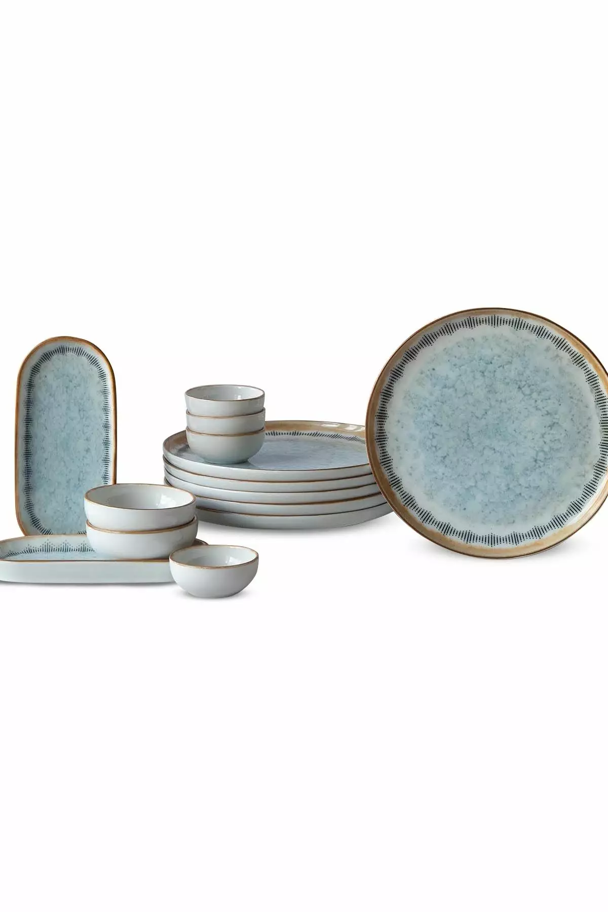 14-osainen Aamiaissetti - 100% Posliini - Valkoinen/Sininen/Kameli - Astianpesukone- ja Mikroaaltouuninkestävä