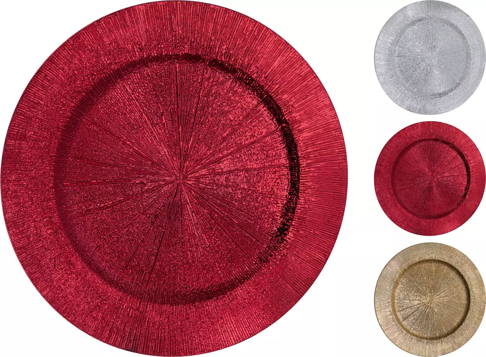 Lisää juhlapöytääsi ripaus ylellisyyttä näillä upeilla teksturoiduilla latauslautasilla. Latauslautasen säteilevä, auringonsäteitä muistuttava kuviointi ja kiiltävä viimeistely heijastavat valoa kauniisti, luoden näyttävän ja tyylikkään kattauksen jokaiseen tilaisuuteen.
