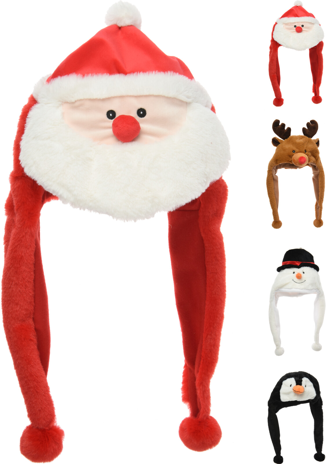 Jouluiset pehmohatut, 50 cm, 4 erilaista designia: lumiukko, pingviini, poro, joulupukki 240x160x540 mm.