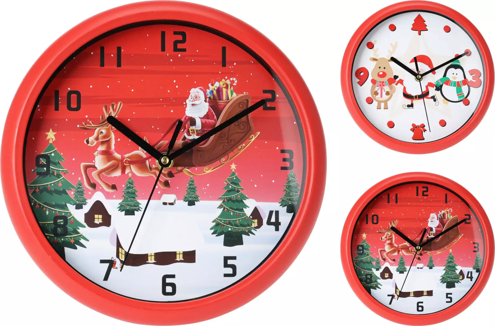 – Punareunainen kello, jossa on animoitu Joulupukki, Petteri Punakuono ja pingviini.