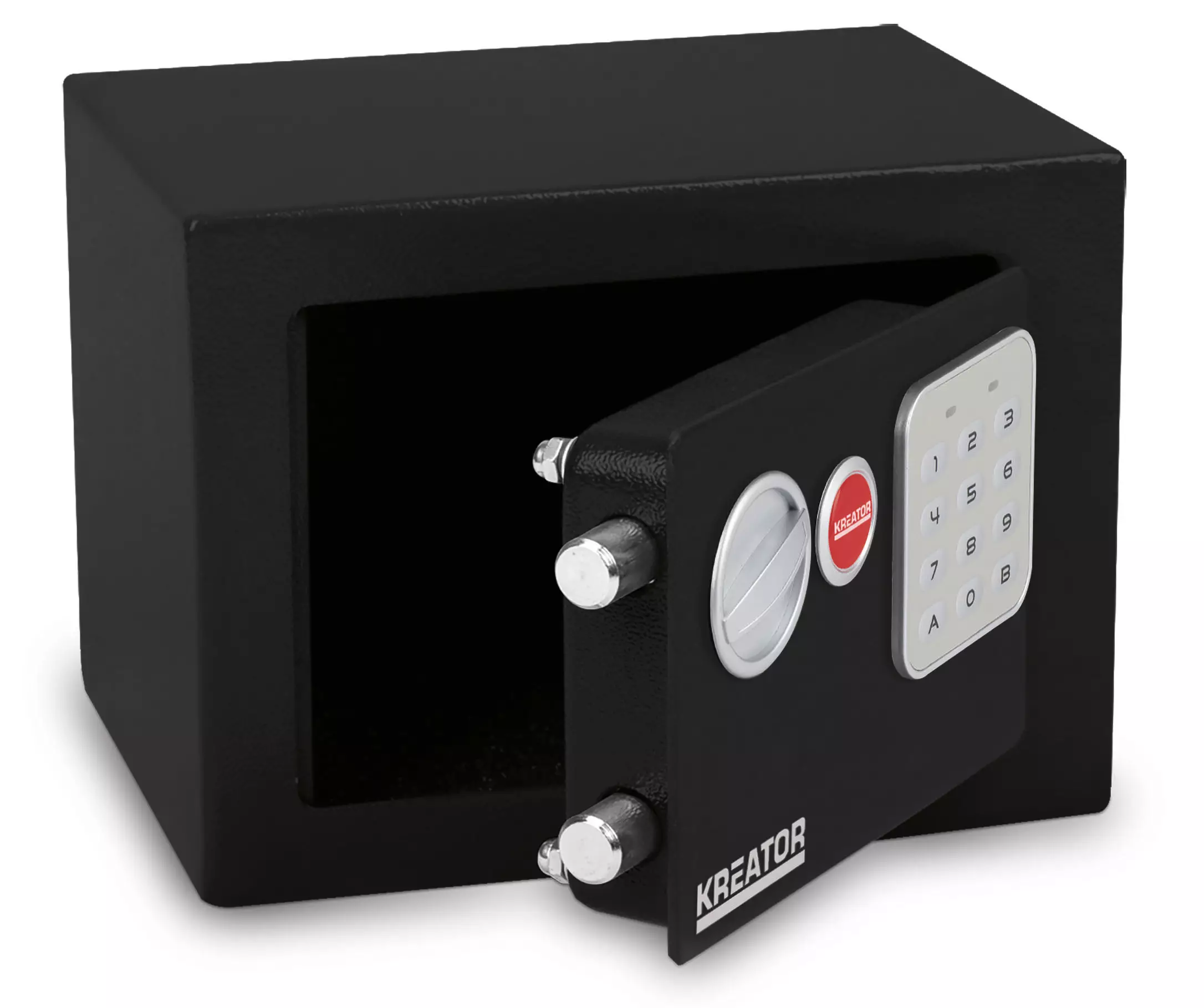 Kassakaappi toimii neljällä AA-paristolla (ei sisälly pakkaukseen) ja siinä on virtailmaisin, joka auttaa seuraamaan paristojen varaustilaa.