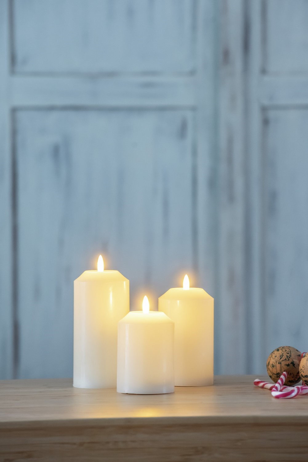 Setissä kolme valkoista, eri kokoista led-vahakynttilää. Valo lepattaa aidon liekkikynttilän tavoin. Led ei vaihdettava.
