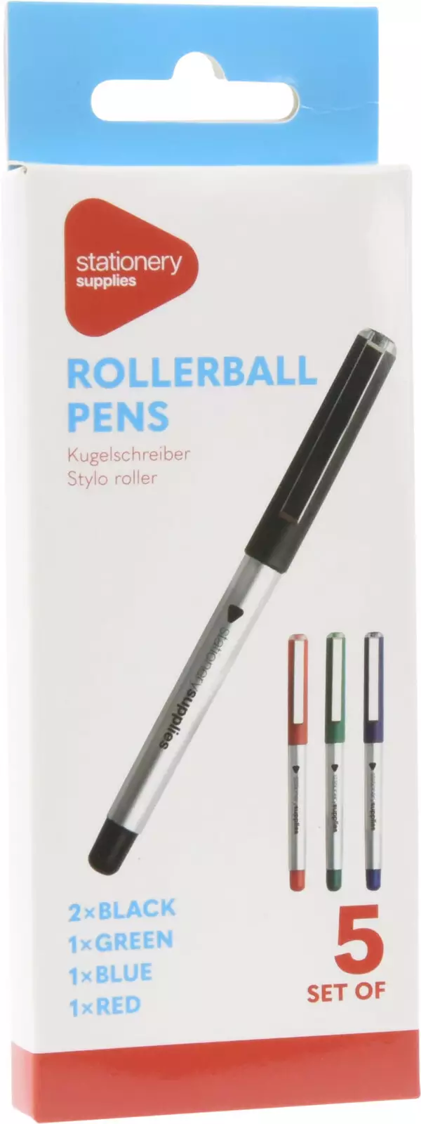 Kuulakynäsetti 5 kpl, perus toimistolinja. Kärjen koko 0,5 mm, sisältää yhden vihreän, yhden sinisen, yhden punaisen ja kaksi mustaa kuulakynää.