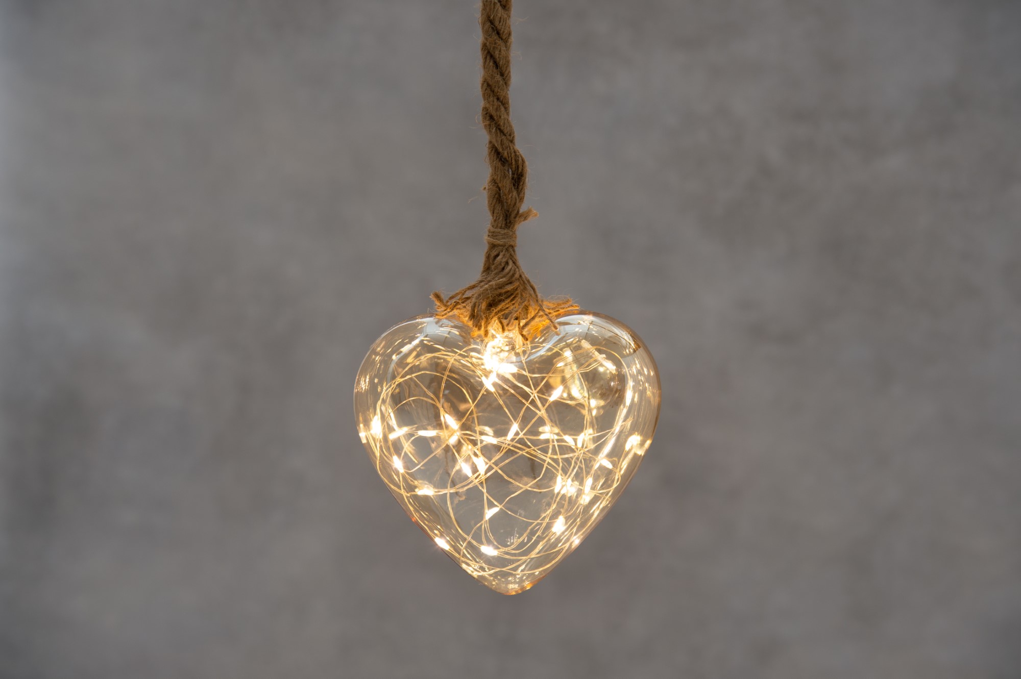 70 cm hamppuköysi, päässä lasisydän, sisällä paristotoimiset lämminvalkoiset 30 kpl microLED valot, ajastintoiminto 6h on /18h off.