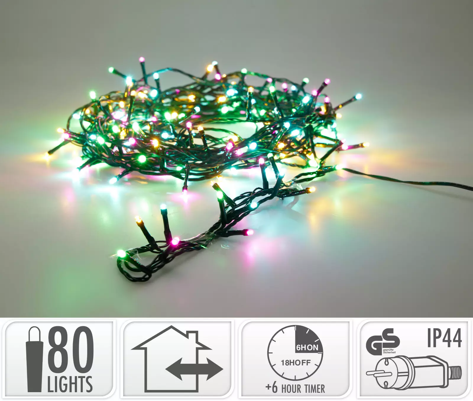 IP44-suojattu adapteri tekee valosarjasta roiskevedenkestävän, joten se soveltuu erinomaisesti myös ulkokäyttöön. Tumma vihreä johto sulautuu kauniisti esimerkiksi kuusen oksille tai puutarhan kasveihin. Laadukas rakenne ja turvallisuussertifiointi takaavat huolettoman käytön.