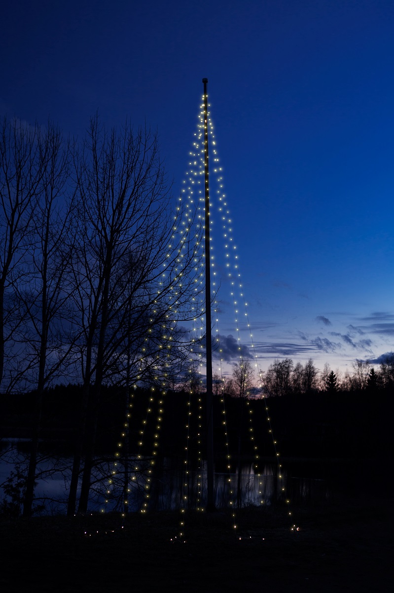 Tässä hyvä malli suositusta lipputankovalosta! Helppo asentaa, ja pysyy paikallaan mukana tulevien tukipiikkien ansiosta. Nyt pihallasi on kaunis valokuusi!