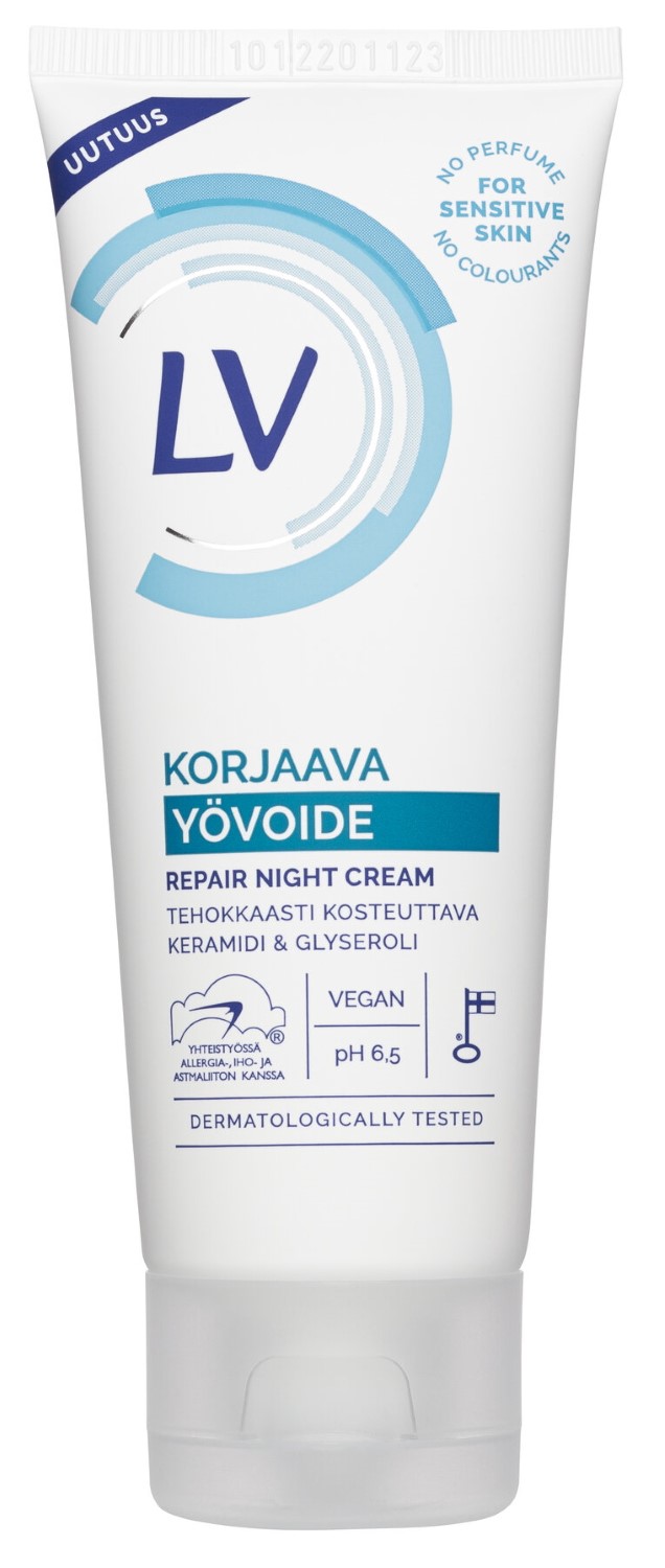 Rauhoittava, hoitava ja tehokkaasti kosteuttava LV Korjaava Yövoide auttaa palauttamaan ihon oman kosteustasapainon. Sisältää ihoa suojaavaa ja korjaavaa keramidia joka lisää ihon hyvinvointia. Voidaan käyttää myös naamiona. Sopii kaikille ihotyypeille.