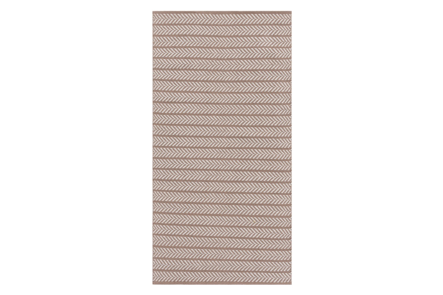 Beige/valkoinen matto 100% käsinkudottua puuvillaa.
