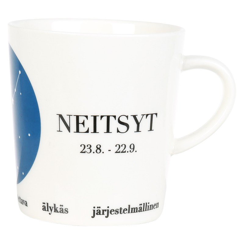 Mukissa Neitsyt-horoskooppimerkin nimen ja syntymäajanjakson lisäksi tähtikuvio ja tyypilliset luonteenpiirteet.