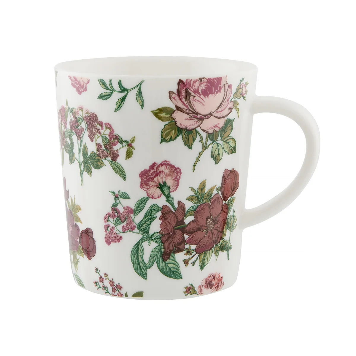 Valkopohjainen keraaminen muki, jonka vetoisuus on 3 dl. Mukissa on romanttinen Ruusu-kuosi, joka on erityisen yksityiskohtainen ja kauniisti väritetty. Mukin sisäosa sekä korva ovat valkoiset.