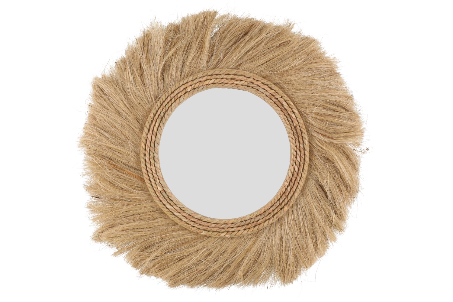 Villiä viidakkotunnelmaa kotiin! Upea peili on kehystetty juuttinarulla ja oljilla. Peili on mahtava yksityiskohta kodissa kuin kodissa, sopii erinomaisesti tuomaan lämpöä yksinkertaiseen sisustukseen, mutta myös lisäämään boheemin sisustuksen villiä puolta.