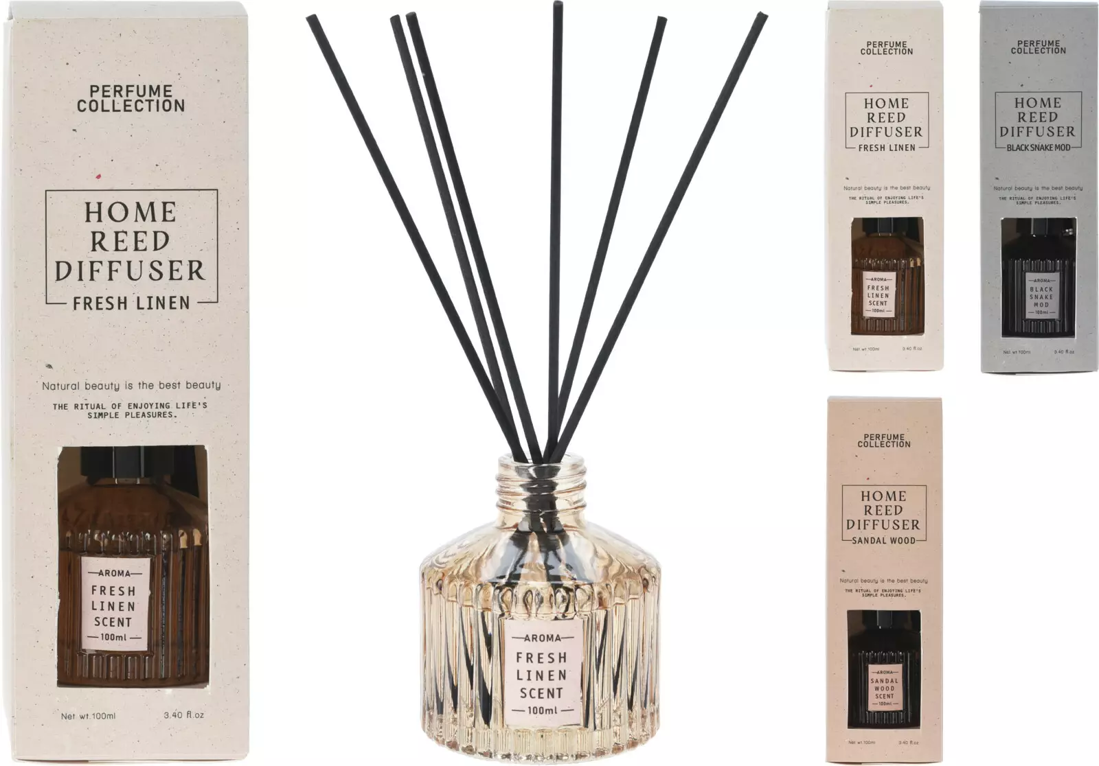 Tyylikäs tuoksudiffuuserisetti, joka sisältää lasisen pidikkeen, 6 rottinkitikkua ja muovisen kannen. Setti on saatavilla kolmessa eri värissä ja tuoksussa: sinisenharmaa, beige ja hiekanruskea. Tämä diffuuserisetti on täydellinen lisä jokaiseen kotiin ja tuo mukanaan rentouttavan tuoksun jokaiseen huoneeseen.