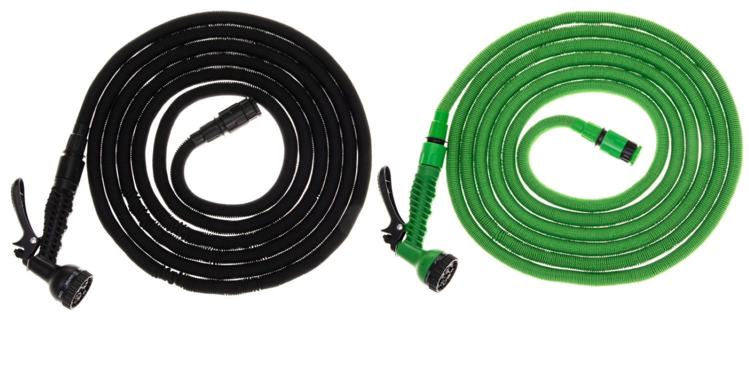 5 - 15 m. Venyvä kasteluletku jossa on kestävä 2 mm kaksikerroksinen lateksinen sisäletku ja päällyskerros on valmistettu erittäin vahvasta neuloksesta. Tämä materiaaliyhdistelmä takaa parhaan mahdollisen käyttöiän venyville letkuille. Mukaan tulee 3/4'' pikaliitin, 3/4''-1/2''-sovitin ja 7-toiminen suihkupistooli.