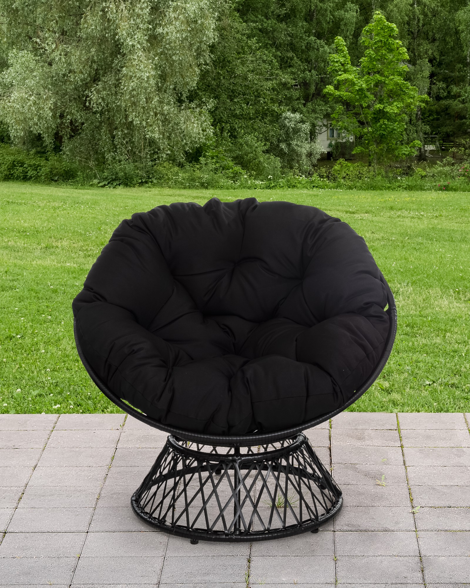 Huippuihana pyöreä lepotuoli on valmistettu kestävästä polyeteenipunoksesta. Tuolissa on teräsrunko ja mukana tulee muhkea pehmuste. Terassin paras paikka on tässä.