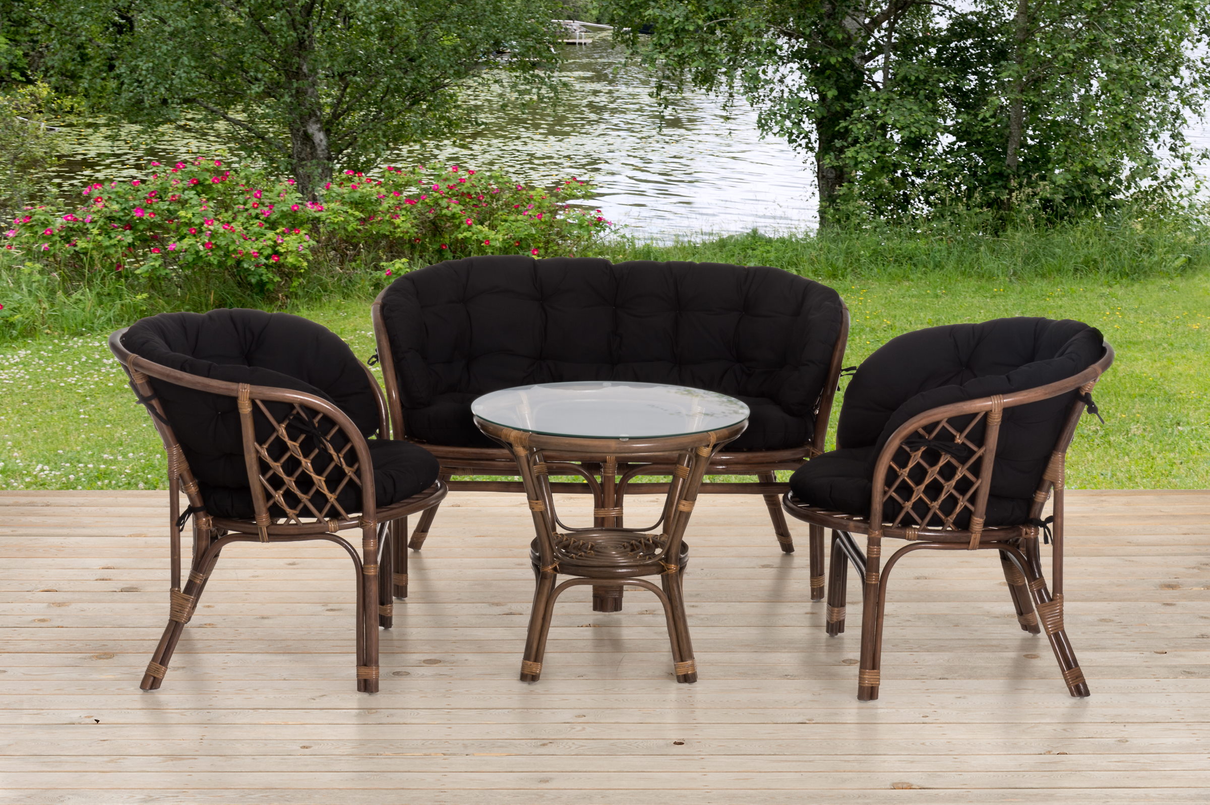 Kaunis rottinkinen oleskeluryhmä muhkeilla, mustilla pehmusteilla ja sievällä pöydällä. Sisä- ja ulkokäyttöön, rottinki on syytä suojata kosteudelta.