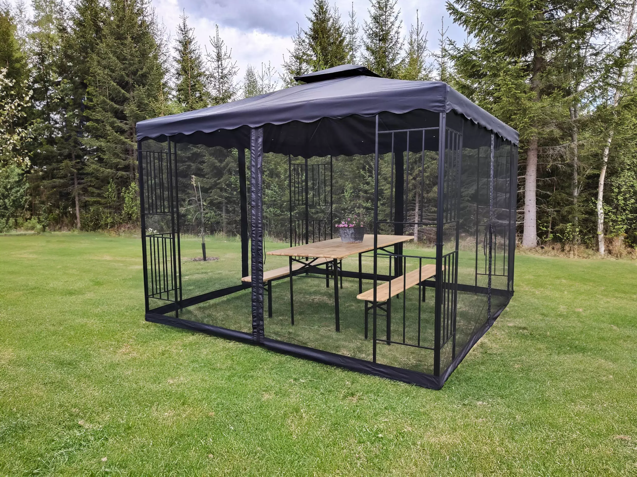 Paviljonki 3 x 3 m Barcelona musta, teräsrunko, hyttysverkot ja vesisuojattu katos