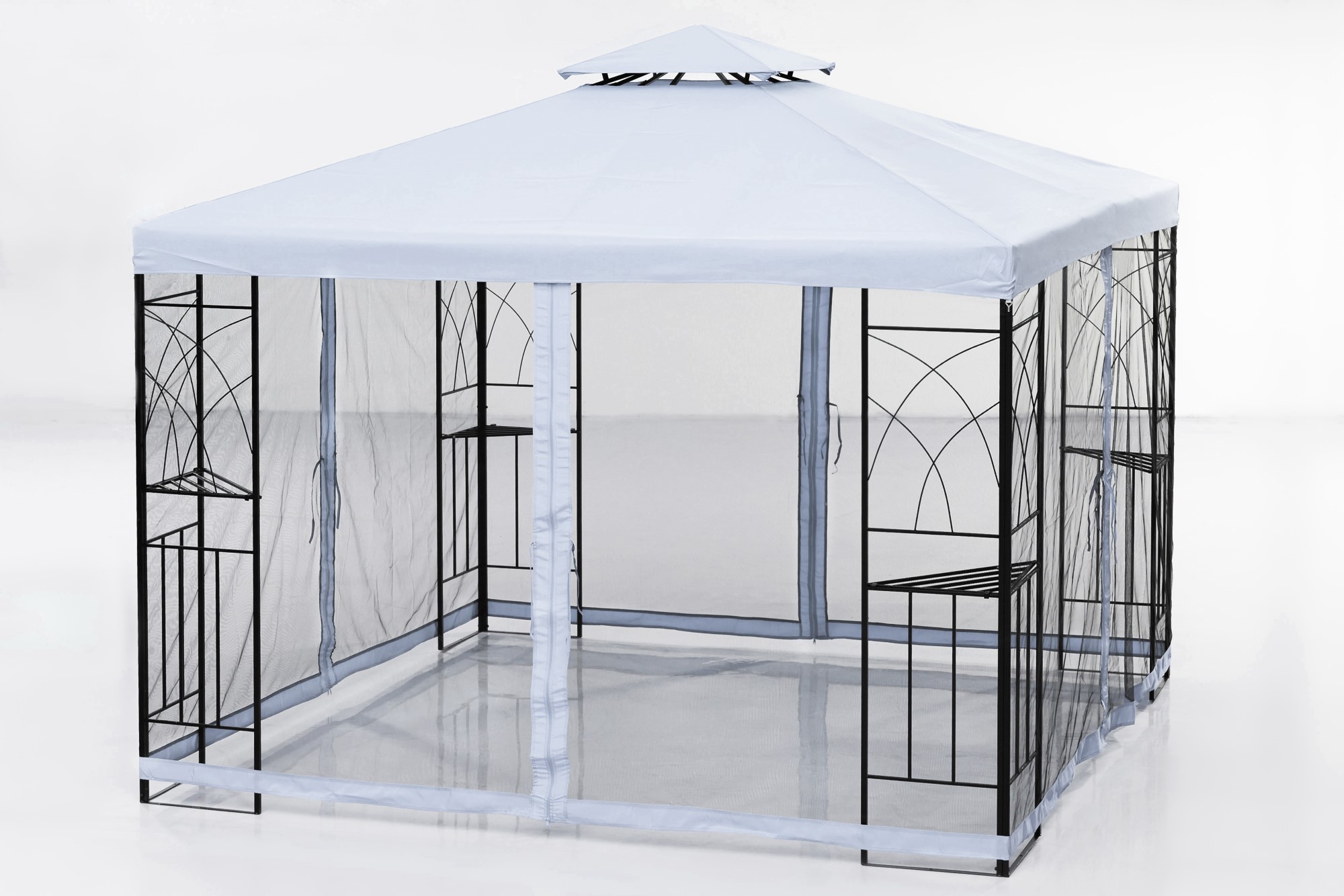 Upea ja siro paviljonki Barcelona puutarhaan. Loistava juhliin sekä kesäiseen arkeen. Kosteussuojattu aurinkokatos mustaksi pulverimaalatulla teräsrungolla. PA-pinnoitettu polyesterikate, jonka vahvuus on 160g/m². Paviljongin keskiosan korotos antaa katokselle ilmavuutta, ja mustat hyttysverkot pitävät kutsumattomat siivekkäät paviljongin ulkopuolella. Kulmissa on hyllytasot, joihin on helppo sijoittaa vaikkapa kukkasia.