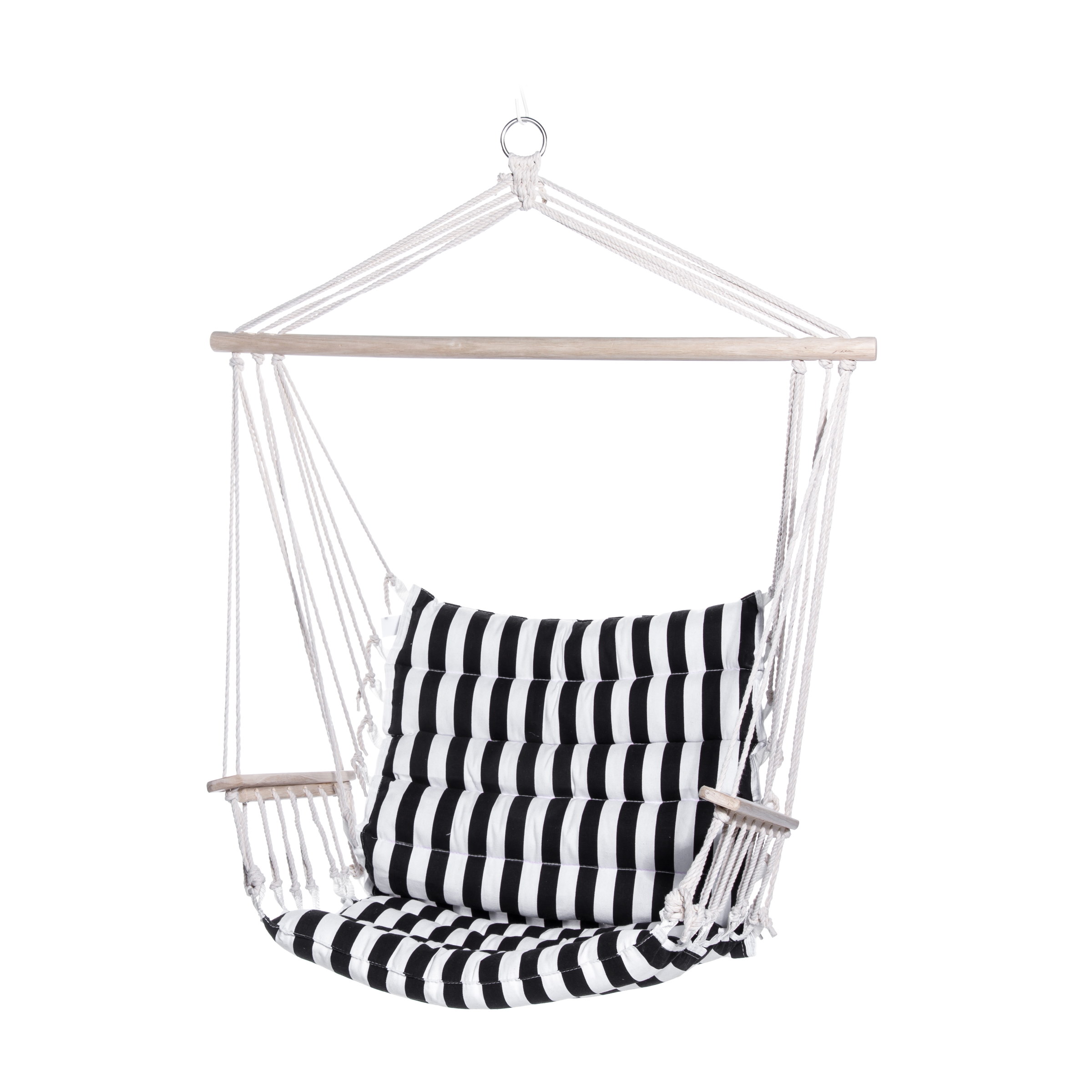 Muhkean pehmeä riippuistuin terassille, parvekkeelle ja puutarhaan! Mainiossa istuimessa on paksu ( 6 cm ) toppaus ja ajaton musta-valkoinen raitakuosi. Kovapuiset levitinosat pitävät tuolin muodossaan ja sen kyyytiin on helppo istahtaa viettämään rentoa aikaa. Kovapuiset käsinojat lisäävat istuimen tuolimaisuutta ja helpottavat istuimesta nousemista. Tuolin mitat ovat 100 x 55 cm ja sen maksimikantavuus on 100 kg.