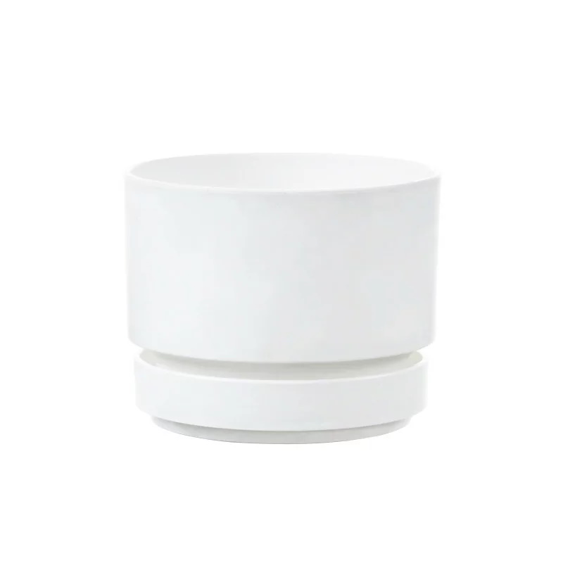 Perinteinen ruukku ikkunalaudalle. Aluslautanen suojaa ikkunalautaa kosteudelta. Ruukun pohjassa reiät, joista ylimääräinen vesi valuu aluslautaselle. Valmistettu kierrätetystä muovista.