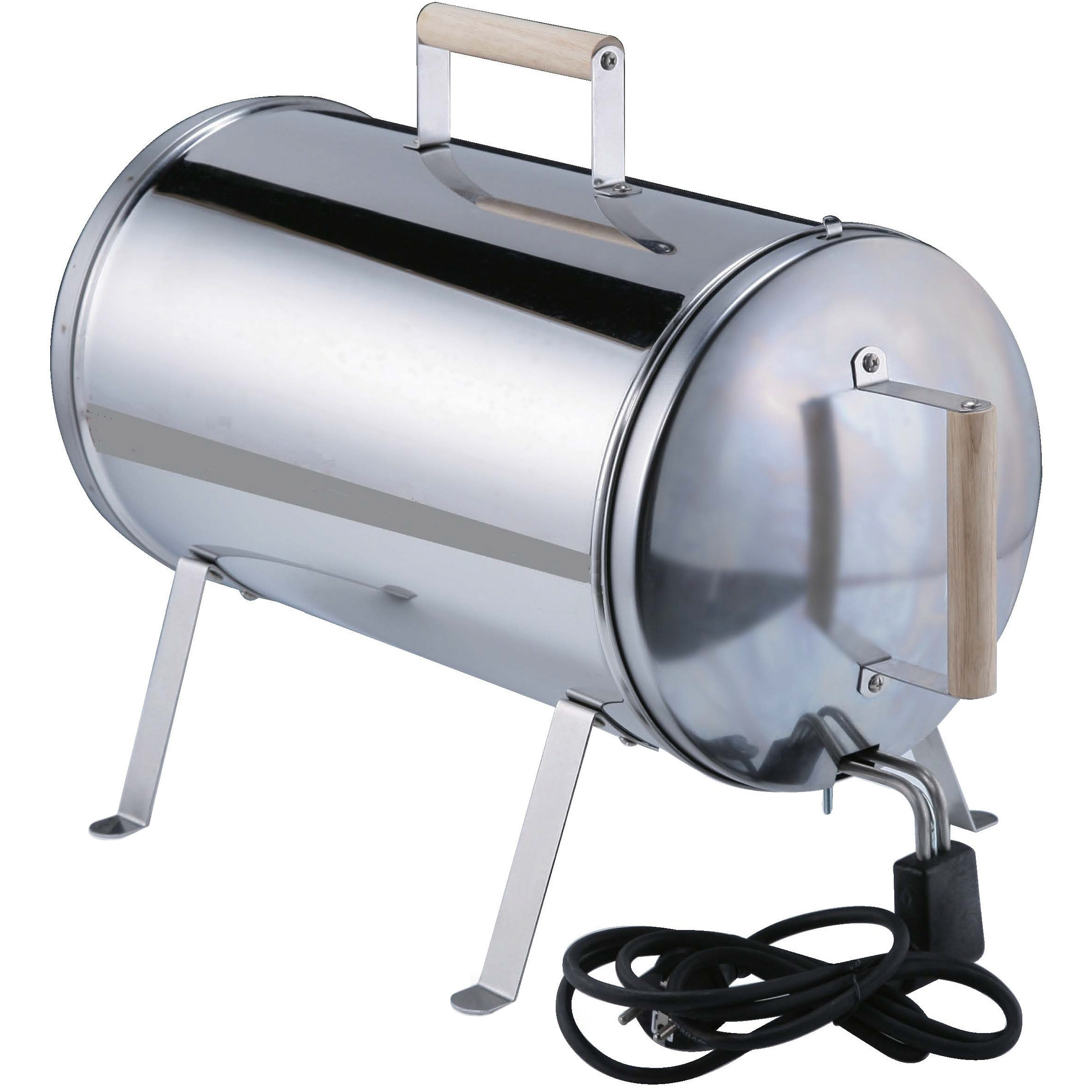 Putkimallinen monipuolinen ja kätevä sähkösavustin. Toimii myös pihauunina ilman savustinlastuja. 230V/50Hz, 1100W. Ruostumatonta terästä, kromattu keittolevy. Ø 33cm. Kumikaapeli HO5RNF. Yksitasoinen, luukku puisella kahvalla, neljä 1,5mm jalkaa.