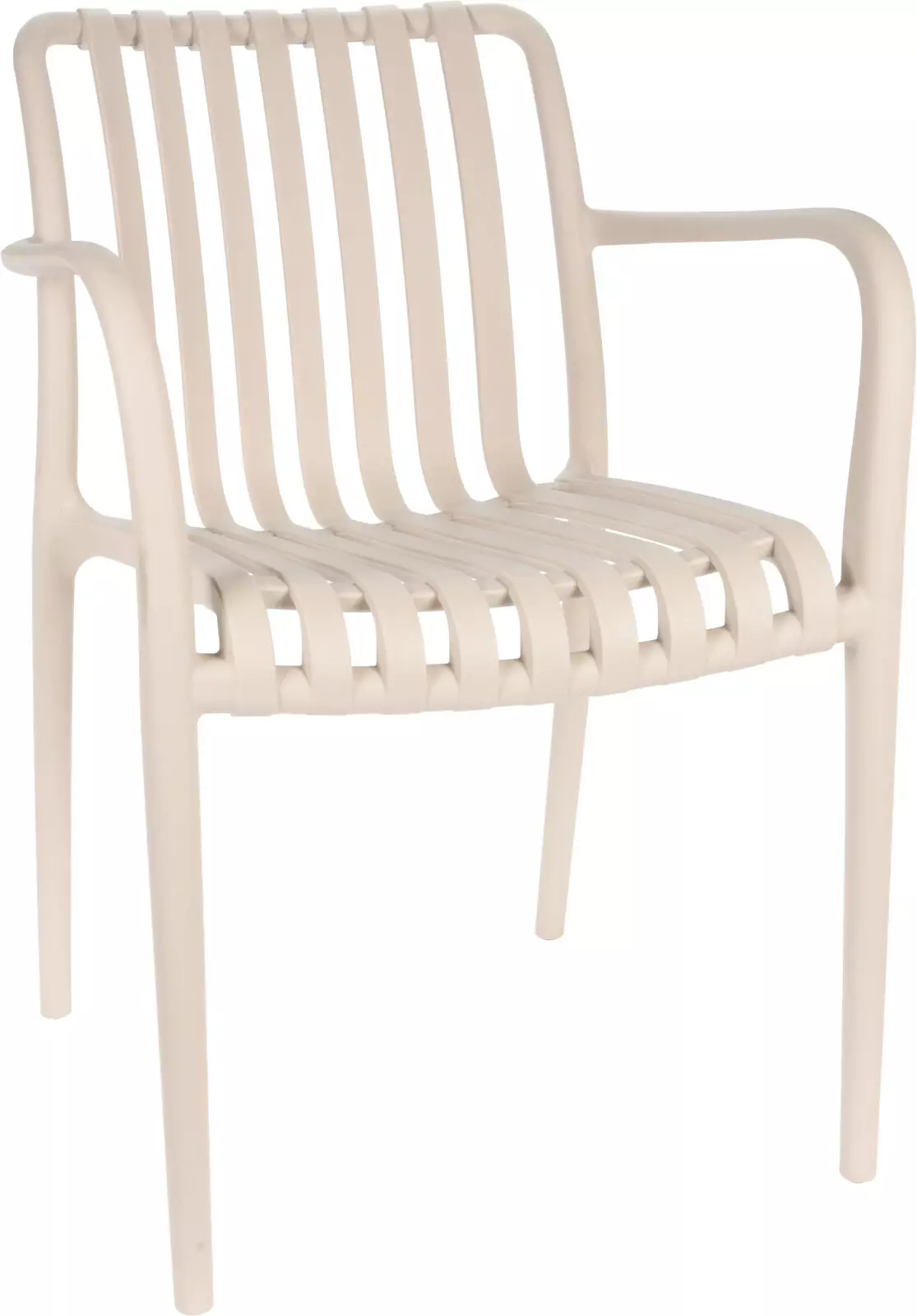 Vaaleanharmaa puutarhatuoli, jossa on käsinojat ja moderni muotoilu. Valmistettu kestävästä polypropeenista, joka on UV-suojattu. Tuolin mitat ovat 55x57xK81 cm. Sopii erinomaisesti terassille tai puutarhaan. EN-581 hyväksytty.