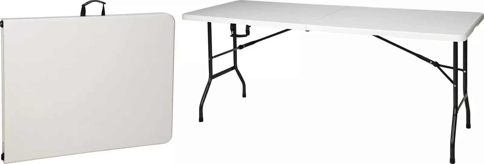 Valkoinen pöytä, kokoontaitettava, 180x70x74 cm, mustat metallijalat, kantolaukkuominaisuus