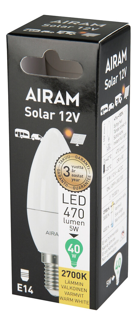 Aurinkoenergian käyttö on kasvussa ja silloin valaistukseen tarvitaan 12V-lamppuja. Tyypillisiä käyttökohteita ovat kesämökit, matkailuautot ja veneet. Lamput toimivat 12V AC/DC-jännitteillä. Varmista 12 V lamppujen ja muuntajan yhteensopivuus, jos käytössä. Ympäristöystävällisiin pahvipakkauksiin on merkitty hehkulamppuvastaavuus, joka helpottaa kuluttajan valintaa. Tekniset tiedot on esitetty selkeästi. Värilämpötila on lämmin valkoinen (2700 K).