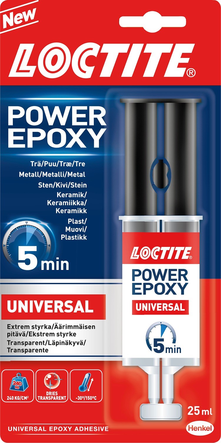 Vahva epoksiliima käytännöllisessä kaksoisruiskussa, joka helpottaa annostelua. Soveltuu mm. puun, metallin, kiven ja lasin liimaamiseen. Kovettuu 5 minuutissa. Lopullinen lujuus 24 tunnissa. Vetolujuus max. 240 kg/cm2 .