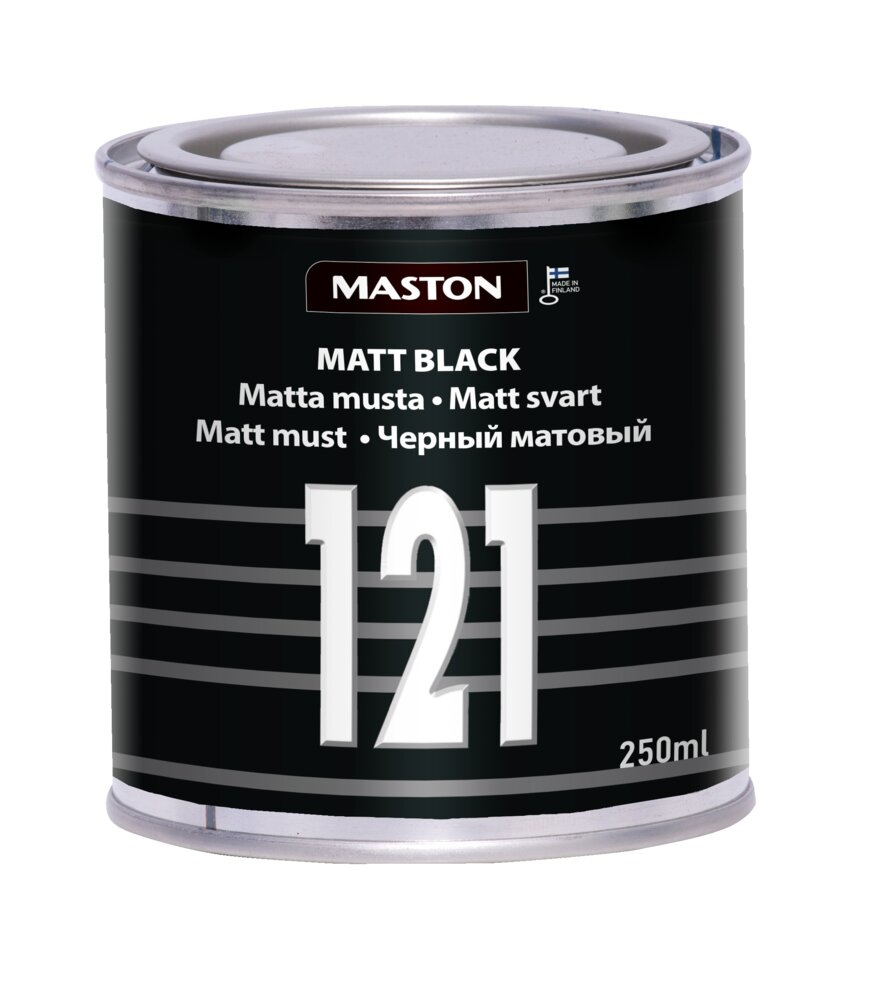 Maston Matta musta 121 on erittäin nopeasti ilmakuivuva alkydimaali sisä- ja ulkokäyttöön. Soveltuu metalli- ja puupinnoille.