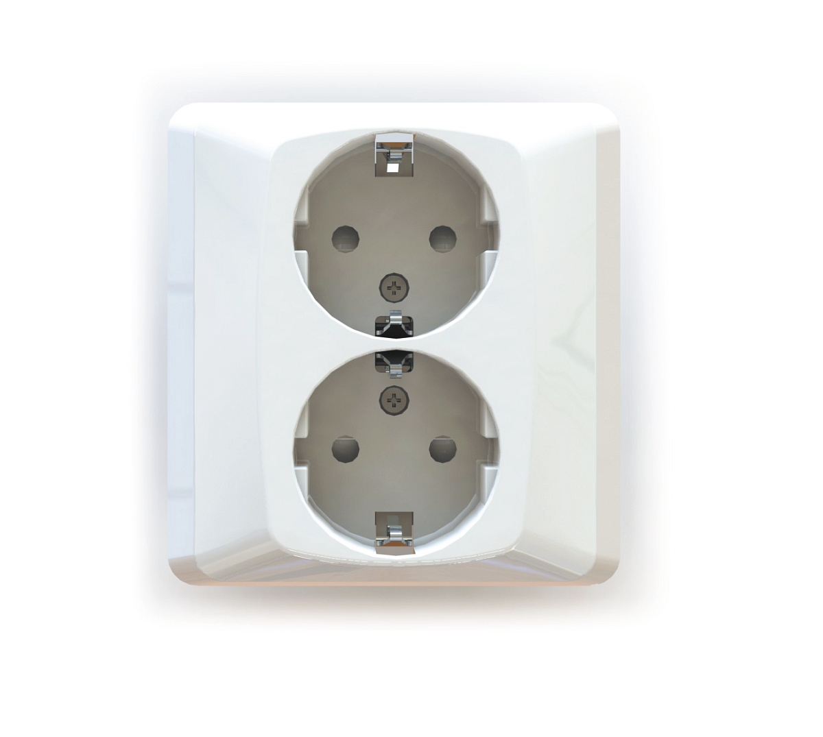 Pistorasia 2-osainen, 16A 250V~, upotettava, maadoitettu, ruuviliittimet, pinta-asennus mahdollinen kotelolla.