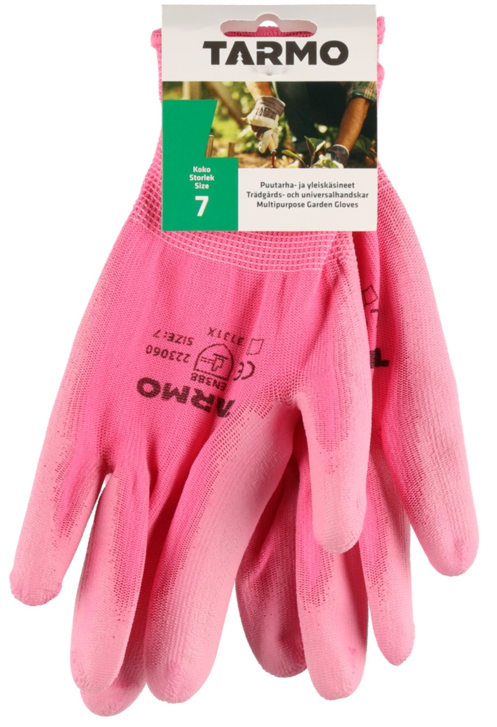 Hyvät yleiskäsineet koti- ja puutarhatöihin. Käsineet ovat kokoa 7, joten sopii pienikätisille. Hyvin istuvilla hanskoilla on mukava työskennellä. Käsineissä on PU-pinnoite, joten tavarat pysyvät hyvin otteessa.