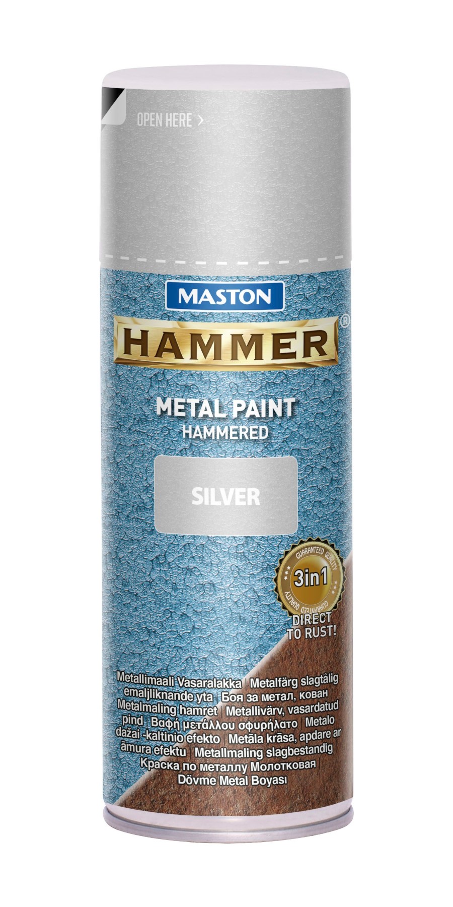 Maston Hammer Hammered vasaralakka metallimaali on varma valinta kaikentyyppisille metallipinnoille sisällä sekä ulkona. Hammered pinnasta tulee luja vasaroitua emalia muistuttava pinta. Sopii uudelle tai vanhalle metallipinnalle. Ruosteiselle sekä maalatulle rauta- ja teräspinnalle. Alumiinille, ruostumattomalle teräkselle, messinki- ja kuparipinnoille suosittelemme pohjamaalausta Maston Alumiini & Galvanoitu metalli pohjamaalilla.