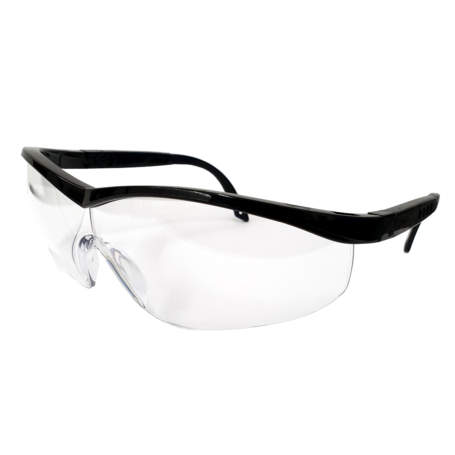 Kirkkaat ja mukavat Ergo-comfort suojalasit polykarbonaattilinssillä ja mustalla sangoilla ja yläkehyksellä. Erittäin miellyttävät pitää päässä pitkään jatkuvassa työssä. Säädettävät sangat.