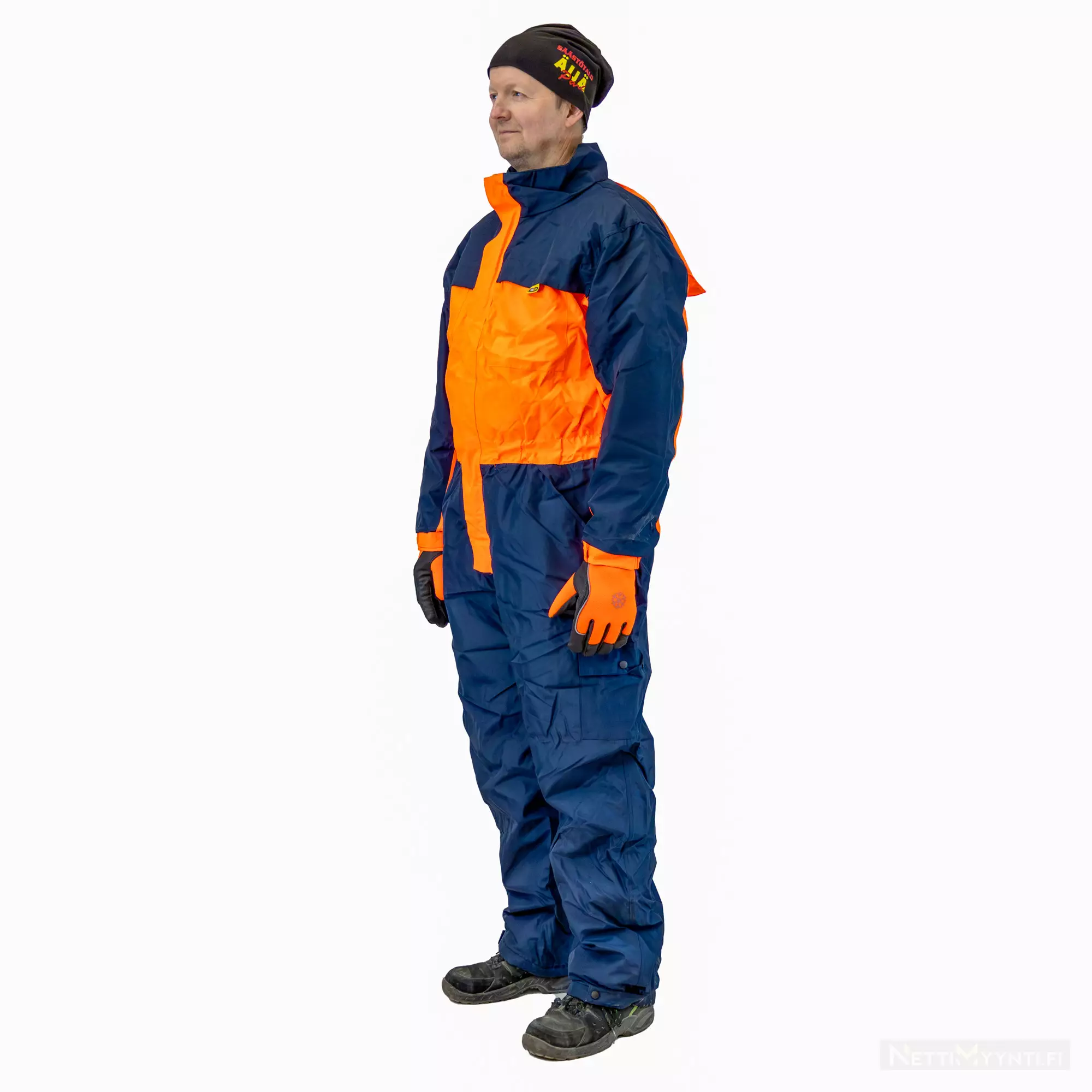 Kestävästä 300D Oxford polyesterkankaasta valmistettu topattu talvihaalari ulkotöihin, kodin remonttitöihinpilkille, pilkille tai vaikka mäenlaskuun. Haalarin kangas on PU -pinnoitettu, joten se hylkii vettä ja likaa sekä on tuulenpitävä. Vuorikangas on 190T polyesteriä ja täyte lämmintä 180g puuvillavanua. Haalarin pääväri on tummansininen, ja sen yläosassa sekä hupussa on hyvin erottuva oranssi väri. Haalarissa on hihansuissa sekä kuminauha- että tarranauhakiristys, jolloin lumi pysyy varmasti hihan ulkopuolella. Haalarin lahkeissa on lahkeensuussa nappilukitus.