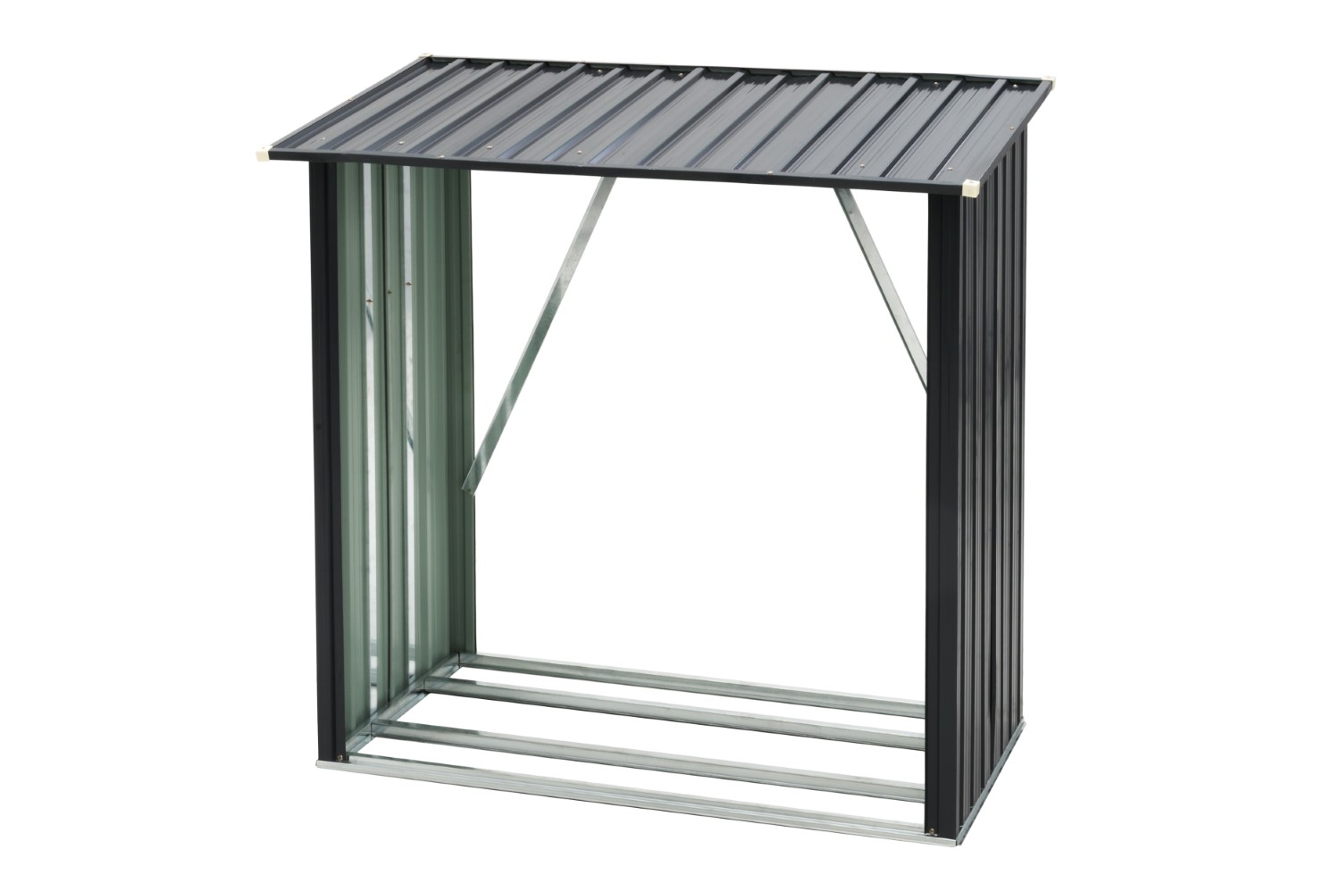 Teräsrunkoinen suojakatos polttopuille. Runko valmistettu 0,6 mm vahvasta sinkitystä teräksestä, seinät 0,25 mm vahvaa tumman harmaata teräslevyä.