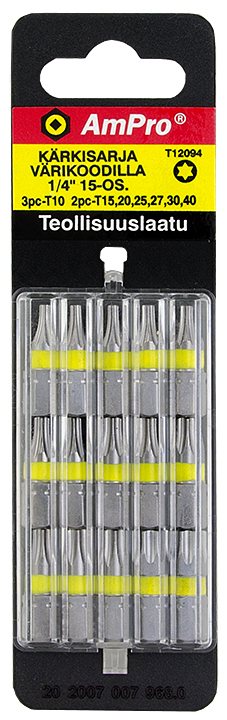 AmPro -materiaali S2-seosteräs -15-osainen Torx-kärkisarja 1/4" sisältää --3 kpl T10 --2 kpl T15 --2 kpl T20 --2 kpl T25 --2 kpl T27 --2 kpl T30 --2 kpl T40 -värikoodatut, väri neonkeltainen... Lue lisää
