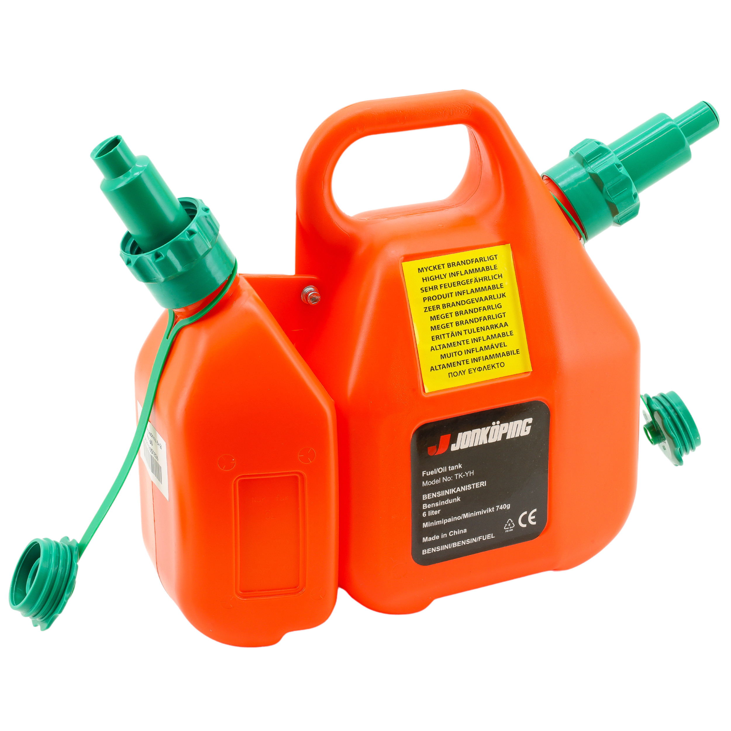 Bensa/öljykannu - sisältää 6 litran bensaosan ja 2,5 litran öljyosan.