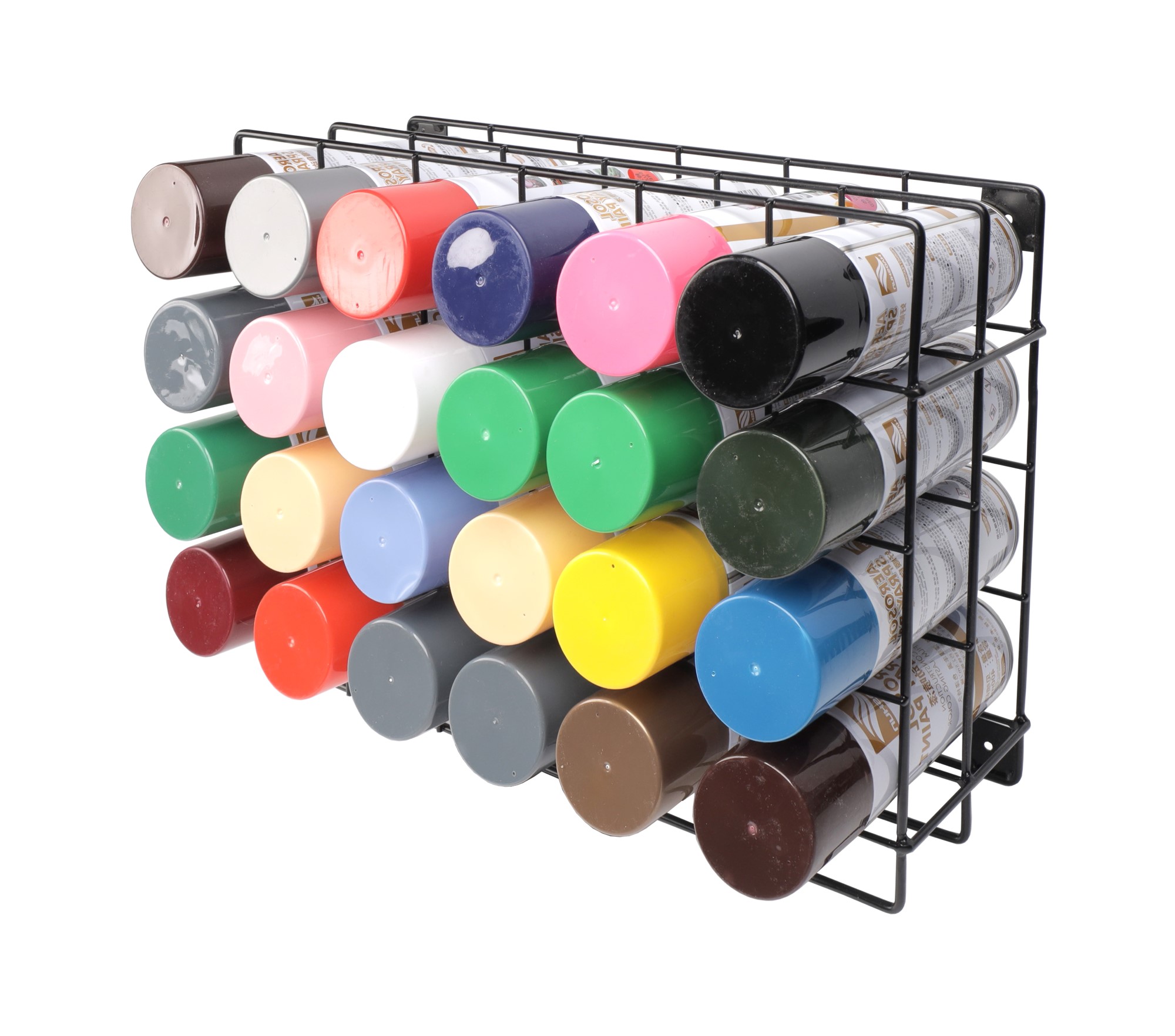 Kätevä teline spraymaaleille ja muille painepulloille. Kiinnitä teline seinään ruuveilla ja aseta pullot telineeseen säilytettäväksi. Toimii hyvin myös vaakaan asennettuna esim. työkaluvaunun päällä.
