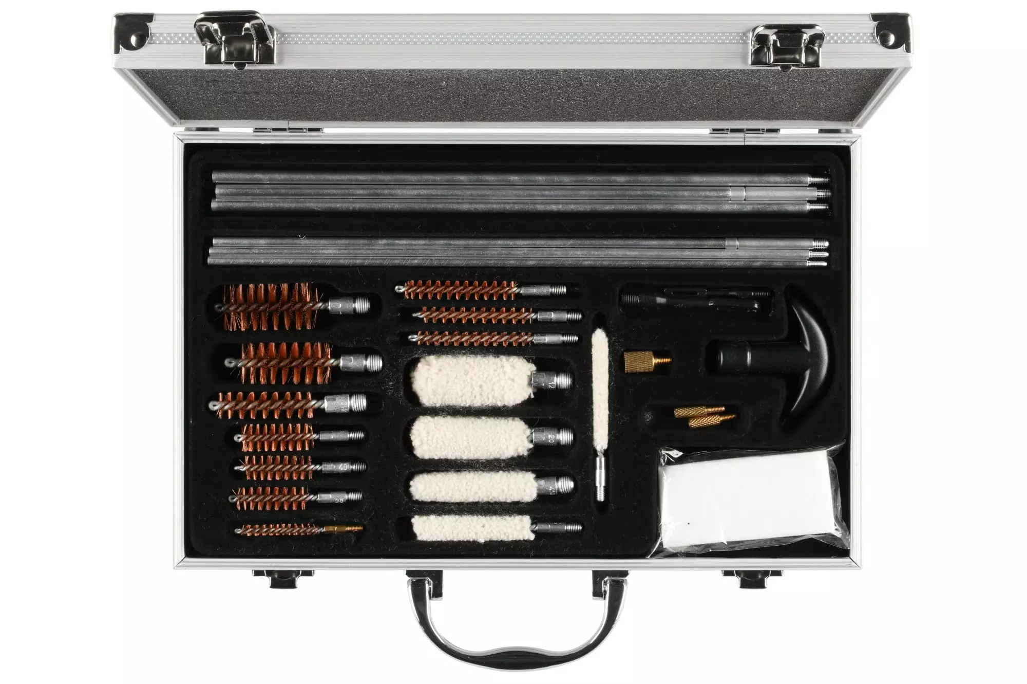 Salkun sisältö: 1 kpl kahva, 3 kpl 17-45 cal. pistoolin/kiväärin alumiinitangot, 3 kpl tankoja, 2 kpl messinkiadapteri, 2 kpl uritettuja kärkiä, 1 kpl kahvasovitin .17cal sauvoille, 1 pussin puhdistuslaastari, 1 kpl 10/12 cal harjat, 1 kpl 20/28 cal harjat, 1 kpl .410 harja, 1 kpl .45 harja, 1 kpl .40 harja, 1 kpl .357/38 9 mm harja, 1 kpl .17 harja, 1 kpl .30 harja, 1 kpl .270/280 holkki, 1 kpl .22 harja, 1 kpl 10/12 cal puhdistusmoppi, 1 kpl 20/28 cal puhdistusmoppi, 1 kpl .410 puhdistusmoppi, 1 kpl .357/38 9 mm puhdistusmoppi, 1 kpl .22 puhdistusmoppi