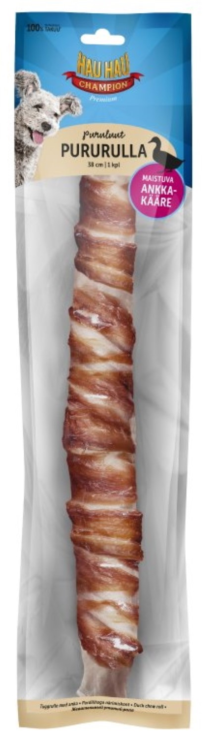 Herkullinen Hau-Hau Champion Ankkapururulla on perinteinen puruluu, jonka ympärille on kieputettu nirsompaakin kirsua hivelevä ankkafilee. Koiran virikkeistämisen ohella tämä herkkuluu edistää myös suunterveyttä ja auttaa pitämään koirasi hengityksen raikkaana. Tätä rouskuvaa herkkuluuta on saatavilla kolmessa eri koossa!